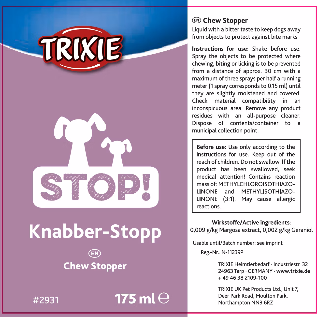 Bit ei Spray (Knabber Stopp) 175ml 79,- • Beskytter gjenstander fra hunder som elsker å tygge med sin bitre smakIngredienser: Margosa extract, Geraniol På lager Legg i handlekurv Lagerbalanse: 6 Artikkelnummer: 2931 Leverandør: Trixie Del Informasjon Tilbakemeldinger • Beskytter gjenstander fra hunder som elsker å tygge med sin bitre smakIngredienser: Margosa extract, Geraniol