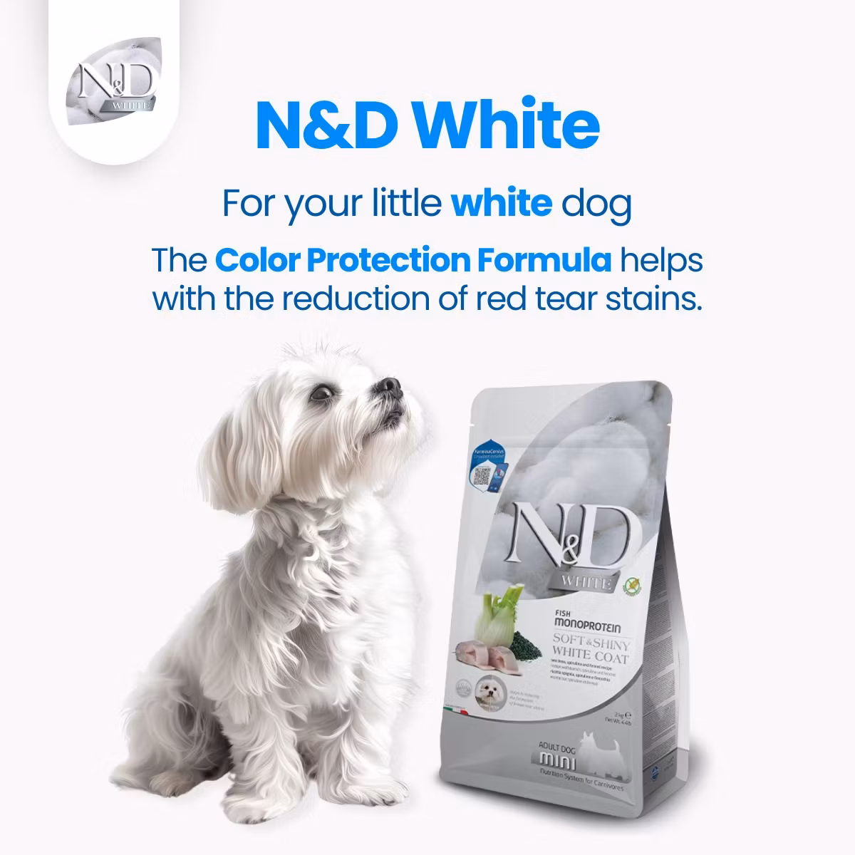Farmina N&D Dog White Sea Bass, Spirulina & Fennel Adult Mini - Hundefôr for hunder med hvit pels