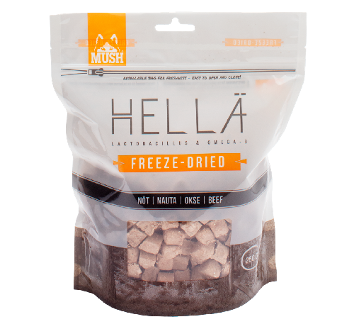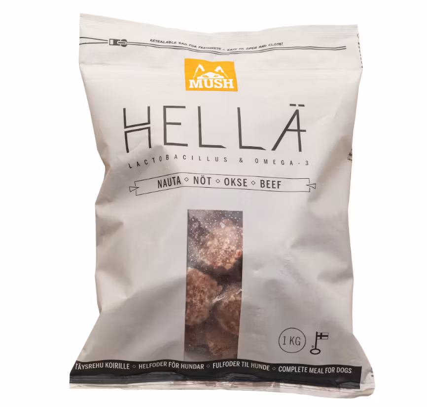 MUSH Hellä® er resultatet av et langt og omsorgsfullt utviklingsarbeid som svar på ønsker fra hundeeiere. Hellä®-serien består av to ulike produkter. Hellä® kylling og Hellä® storfe.