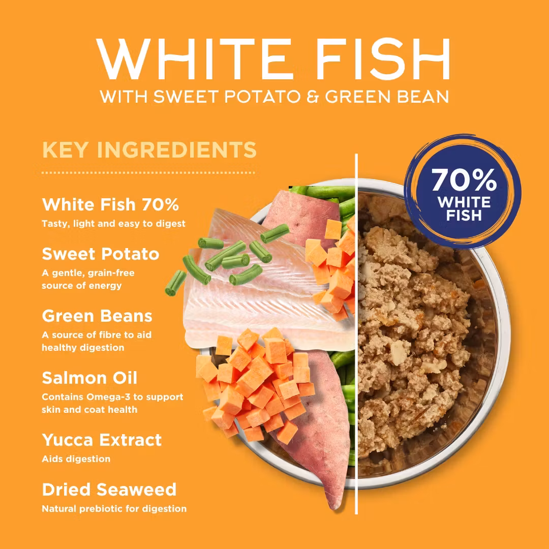 Hvit fisk (70%), tørket søtpotet (1%, tilsvarer 4% søtpotet), grønne bønner (1%), lakseolje (0.5%), mineraler, yuccaekstrakt (0.05%), tørket tang (0.05%)