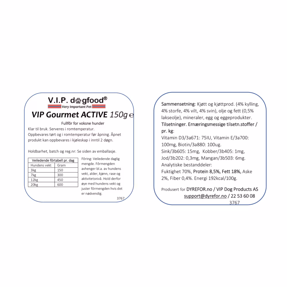 Sammensetning: Kjøtt og kjøttprod. (kylling, storfe, vilt, svin), egg, olje og fett.