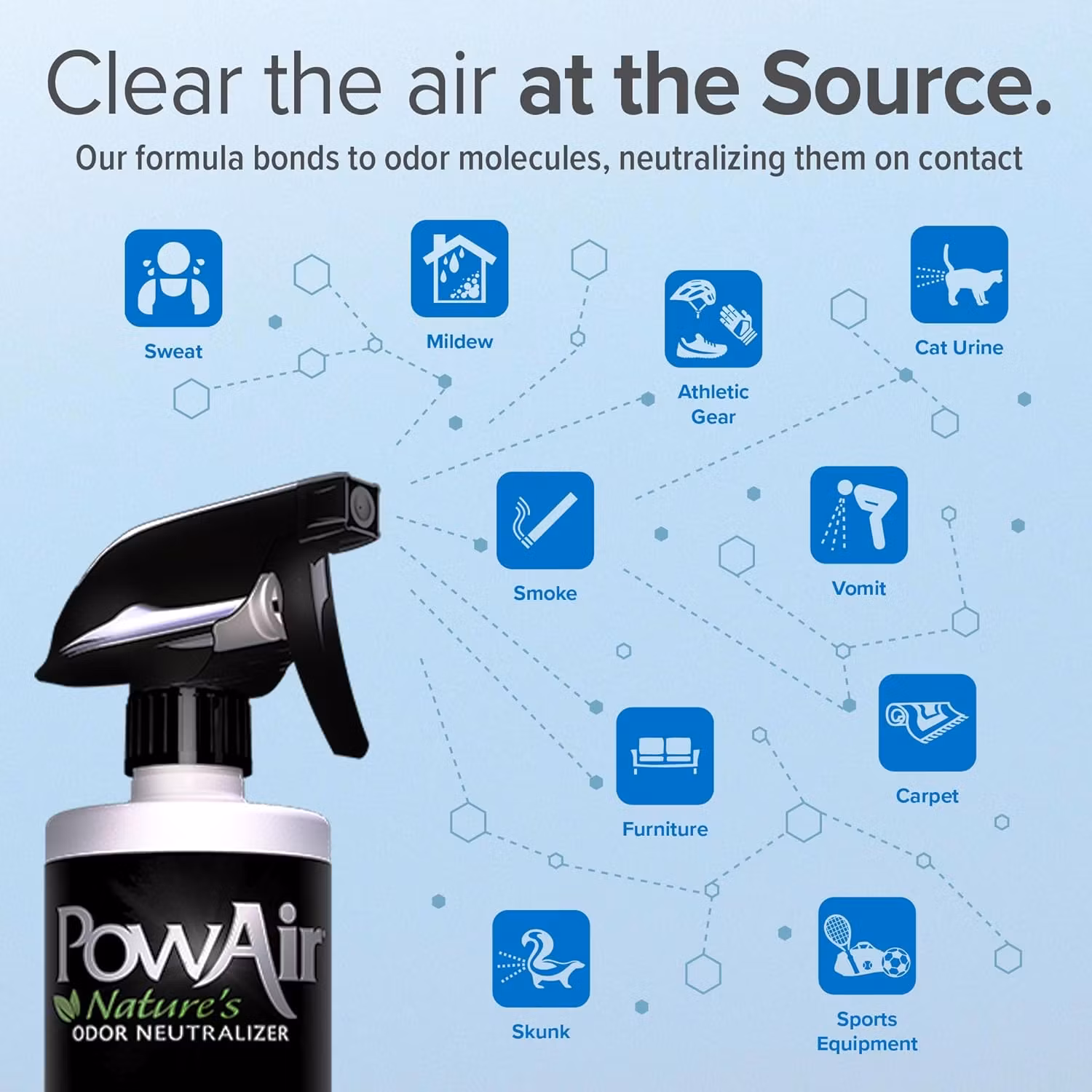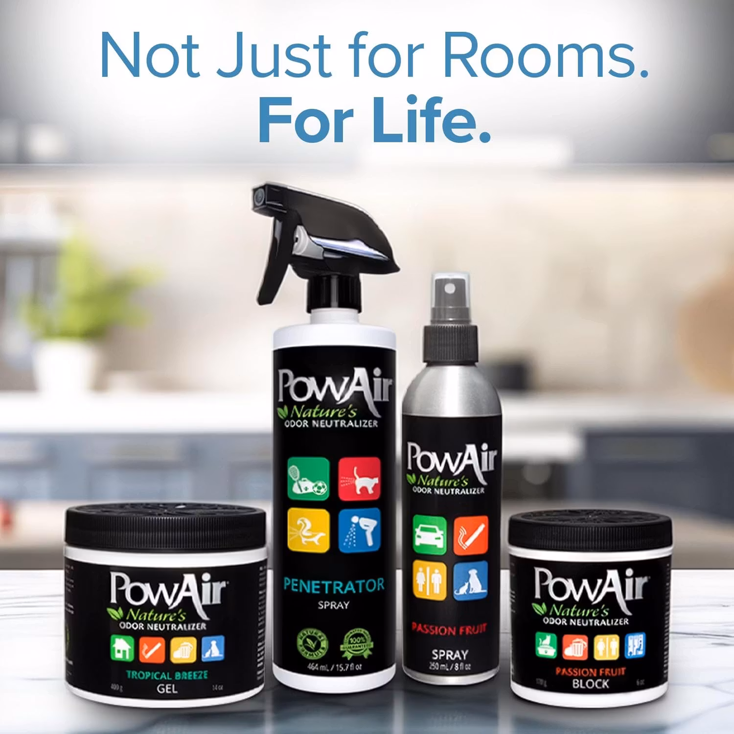 PowAir Penetrator er en kraftig overflatespray som kombinerer naturlige mikrobielle enzymer og essensielle oljer for å eliminere organiske lukter som er fanget i materialer som tøy, tekstiler, møbeltrekk, tepper, tre og betong.