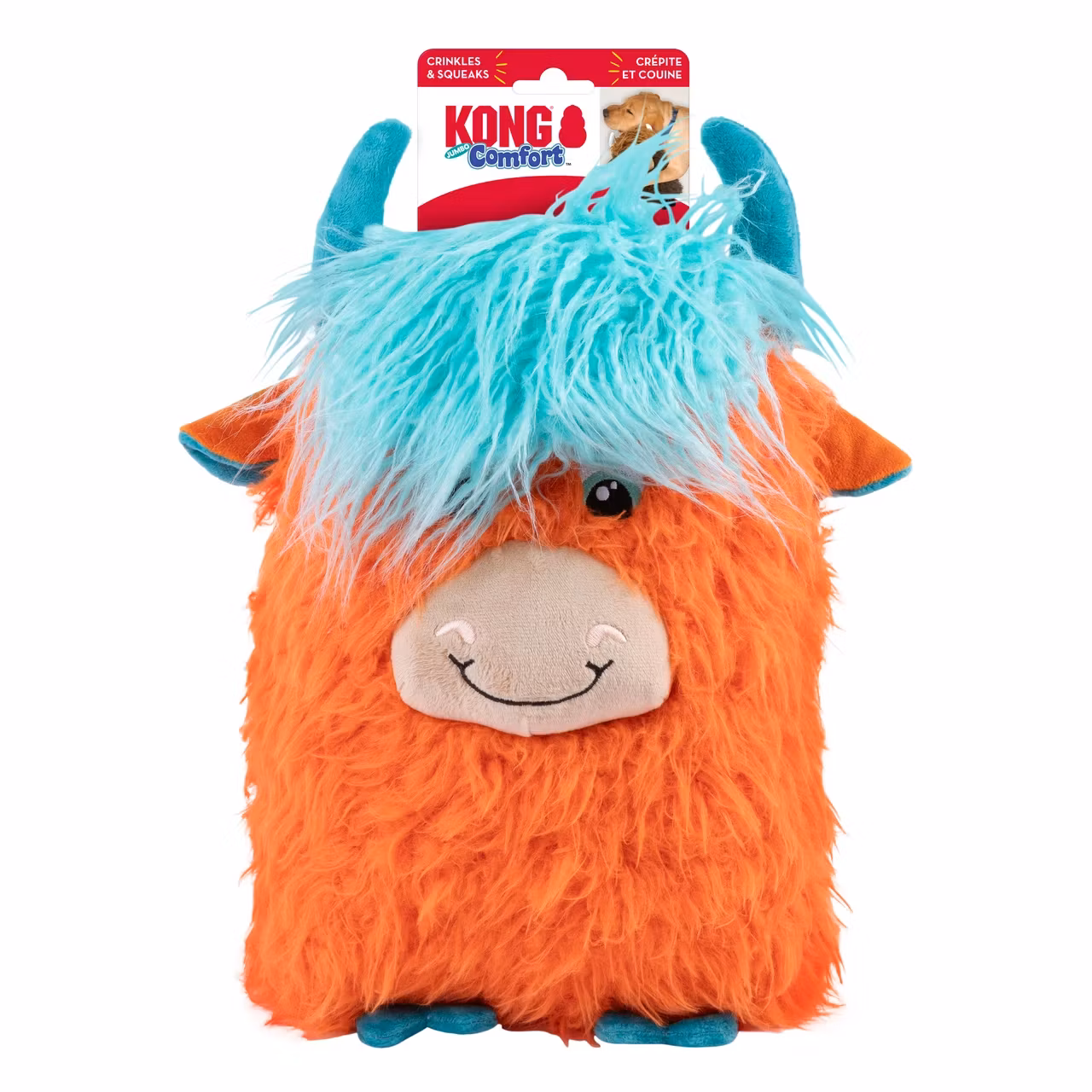 KONG Comfort Jumbo Highland Cow gir en kul ku-følelse med sin ville, rufsete pels og hengende hår. En gigantisk plysjkropp – med forskjellige stoffteksturer, 3 pipelyder og krøllete materiale inni hver hov og hengende hår – holder hunder i alle størrelser underholdt med multisensoriske funksjoner under leken. Når festen er over, er denne kuas avslappede holdning perfekt for avslapning og kos i løpet av lurtiden.