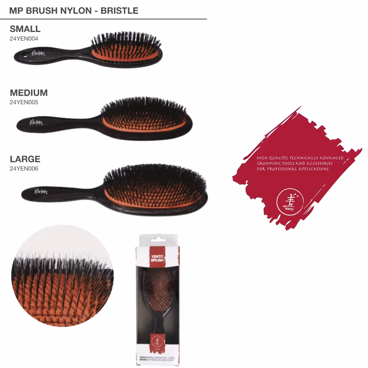 Yento-børstene er de første profesjonelle børstene av sitt slag som er laget spesielt for hunder. Disse børstene er av enestående kvalitet og bruker kun de beste naturlige bustene fra villsvin. De unike egenskapene til den rene villsvinbusten renser mens du børster, og etterlater pelsen med en sunn, naturlig glans. Yento ren buste er ideell for korte eller fint teksturerte pelser, som Yorkshire terriere og maltesere. Yento ren buste med nylon er spesielt designet for lange og tykkere pelser. Nylontrådene hjelper til med å trenge gjennom tettere hår, som hos skjeggcollies og tibetanske terriere. Alle Yento-børster er produsert etter strenge standarder av erfarne håndverkere og er garantert i ett år fra kjøpsdato.