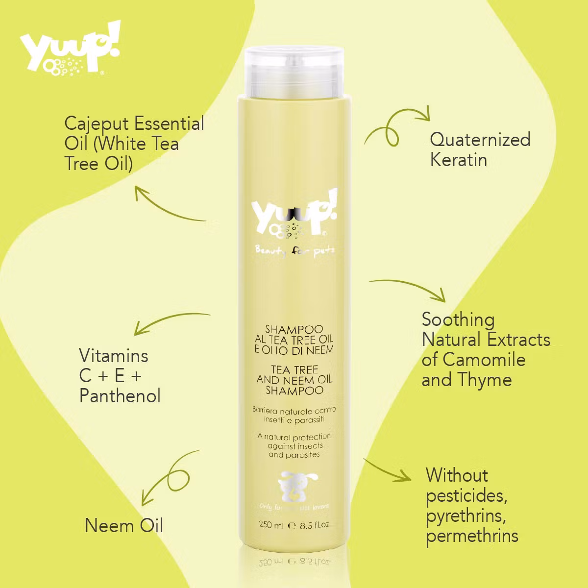 Basert på essensielle olje av cajeput (Tea Tree Olje hvit) og Neem olje og beriket med Keratin, vitamin C + E + panthenol og lindrende ekstrakter av timian og kamille. Passer både for hunder og katter.