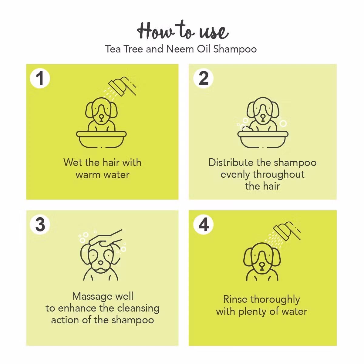 Bruk: Passende dose fordeles i våt pels, masser huden godt og fordel utover pelsen. Skyll godt med rikelig mengde vann.