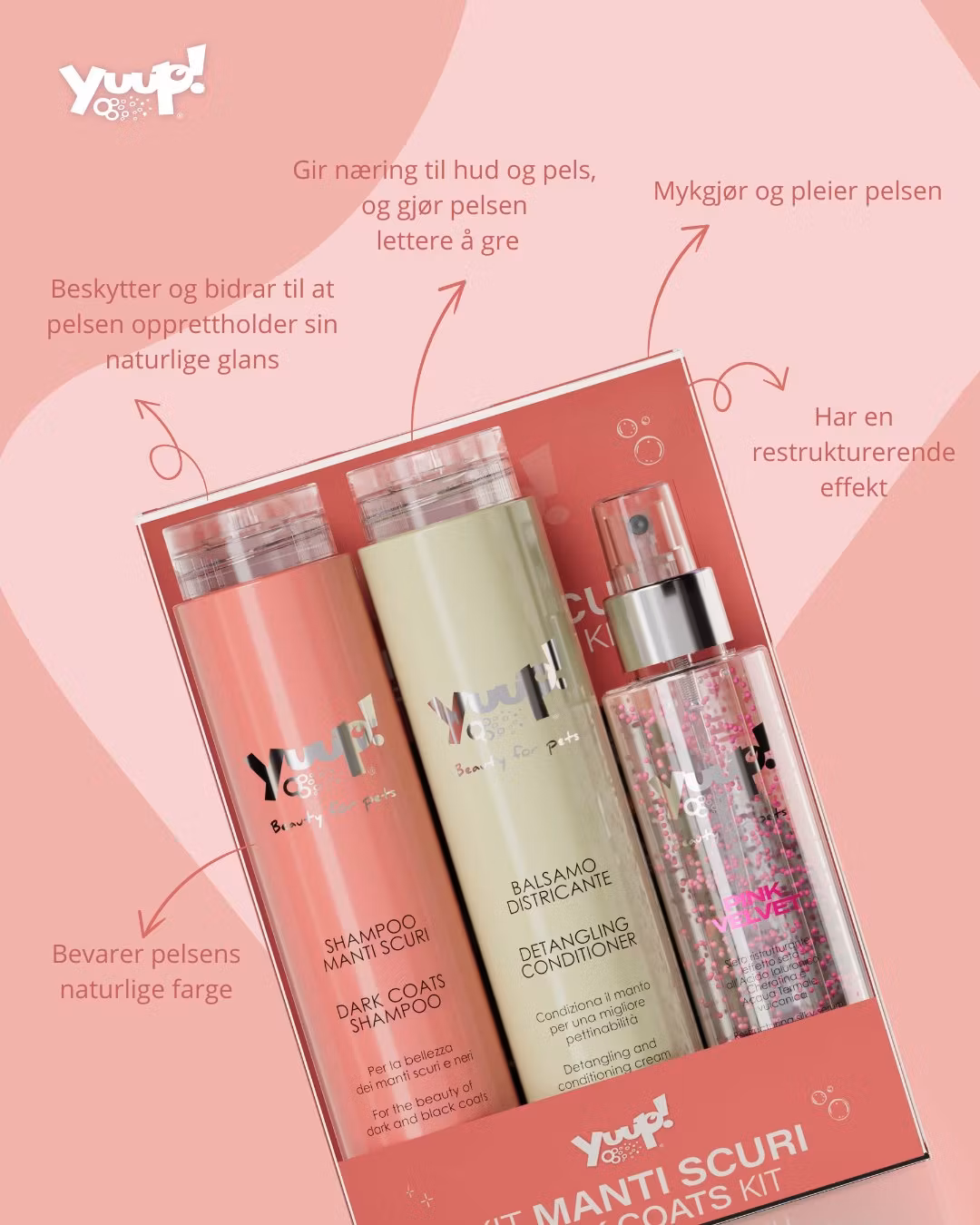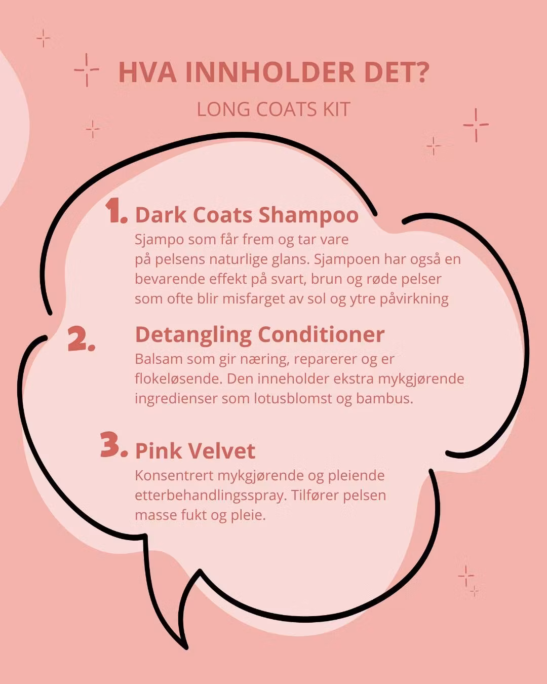 Gavepakke som inneholder sjampo for sort pels, balsam og Pink Velvet