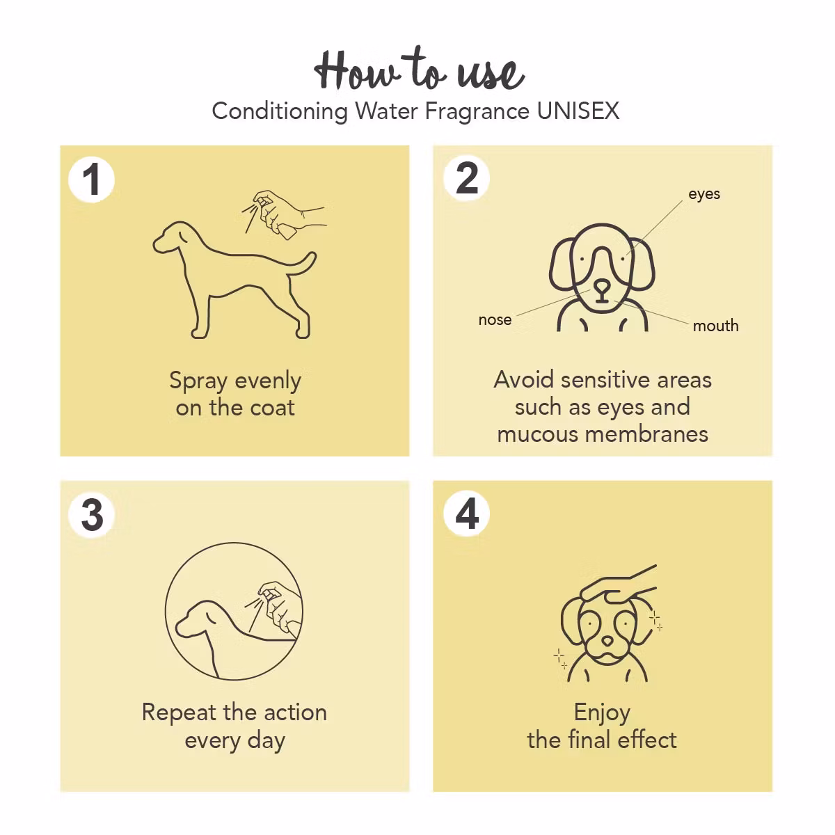 Alkoholfri kondisjonsparfyme beriket med kvaternisert keratin for en skjønnhetsbehandling med en polerende og filtrende virkning på håret og fukter hundens hud. UNISEX parfyme med forfriskende toner av talkum og hvit musk.