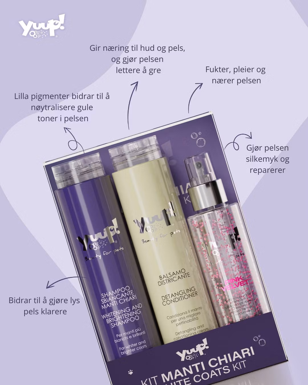 Sjampo spesielt for lys pels, med et spesielt pigment som motvirker gulning ved første påføring. Både kvaternisert keratin, vitamin C + E og panthenol (provitamin B5) er dyptvirkende. Bambus-esktrakt, lotusblomst og linfrø-ekstrakt gir glans og beskyttelse. Passer for både hunder og katter.