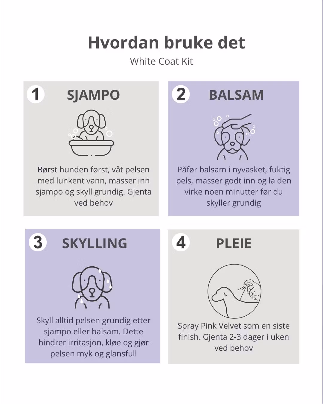BRUK: Passende dose fordeles i våt pels, masser huden godt og fordel utover pelsen. Skyll godt med rikelig mengde vann.