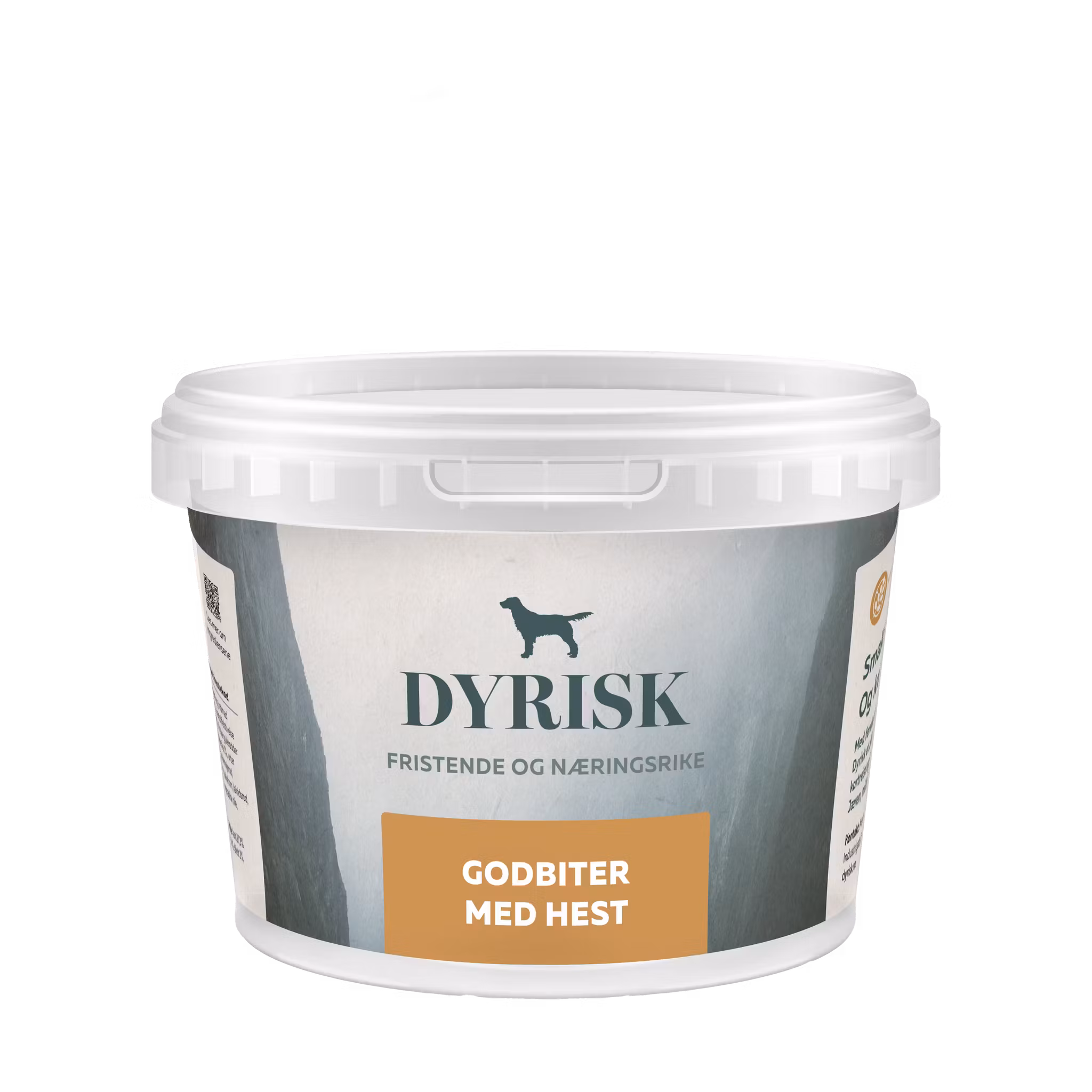 Innhold: Ferskt kjøtt og innmat fra hest 52%, potetmel 21%, potetstivelse 15%, fersk potet 4%, fersk gulrot 2%, ferskt eple 2%, lakseolje 1%, urter (peppermynteblad, gurkemeierot, fenikkelfrø, karve, bukkehornkløver, lakrisrot, kamilleblomst) 1%, vegetabilsk olje, mineraler, salt.