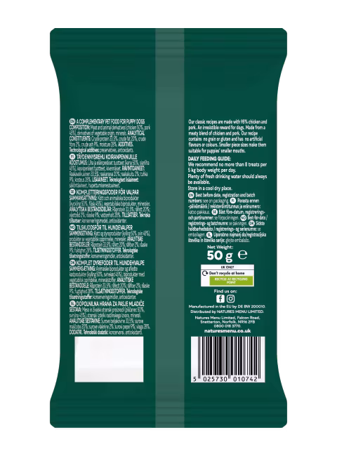 Natures Menu Puppy kjøttfulle godbiter er den ultimative treningsbelønningen til valpen din. Laget med 95% ekte kylling og svinekjøtt. En uimotståelig belønnings-godbit for valper som ikke inneholder gluten.