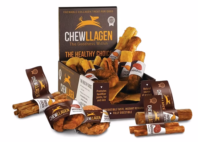 Chewllagen hundetygger er 100 % naturlig tyggbare kollagengodbiter for hunder. Chewllagen hundetygger er laget av kollagenet utvunnet fra søramerikansk gressfôret storfeskinn.