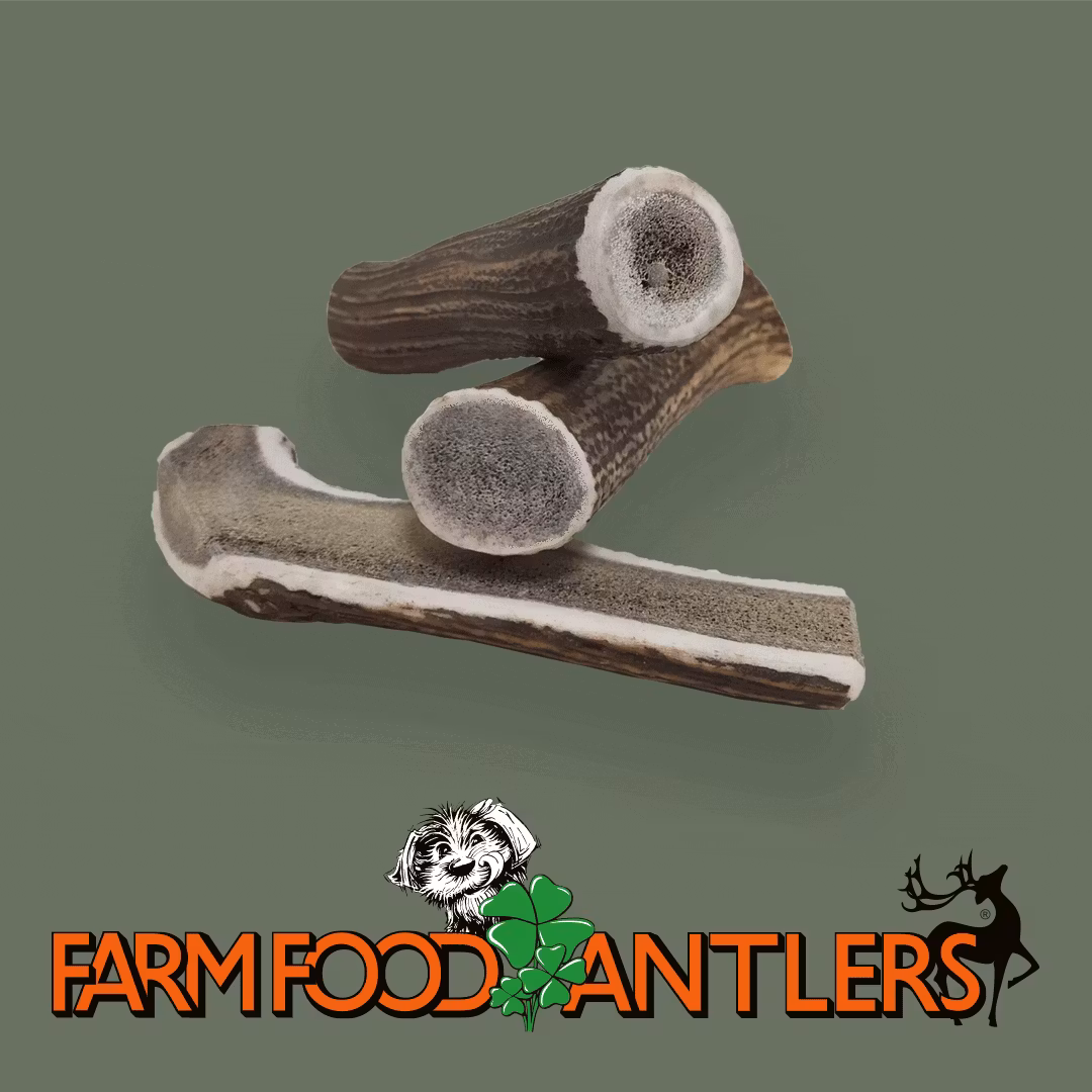 Farm Food Antlers er gevir av mannlige hjort. De mister gevirene etter parringen på våren. Disse vokser ut på ny. Gevirene våre samles inn i Europas skoger, deretter børstes og kuttes de etter en kvalitetskontroll. Som et helt naturlig produkt, Farm Food Antlers kan fremdeles ha en jordlig lukt, og alle er forskjellige i farge, vekt, form og tykkelse.